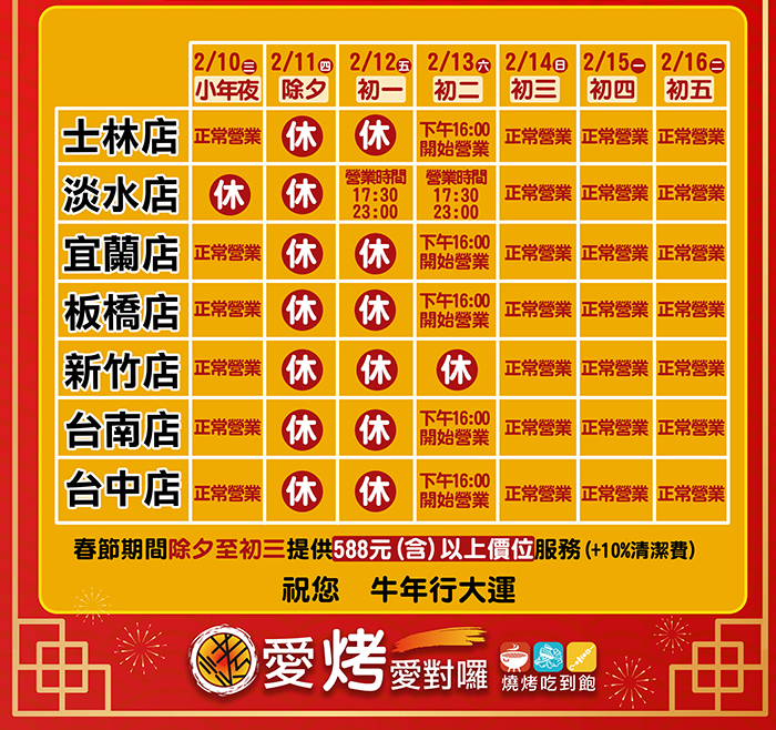 除夕至初三提供588元(含)以上價位服務(+10%清潔費)